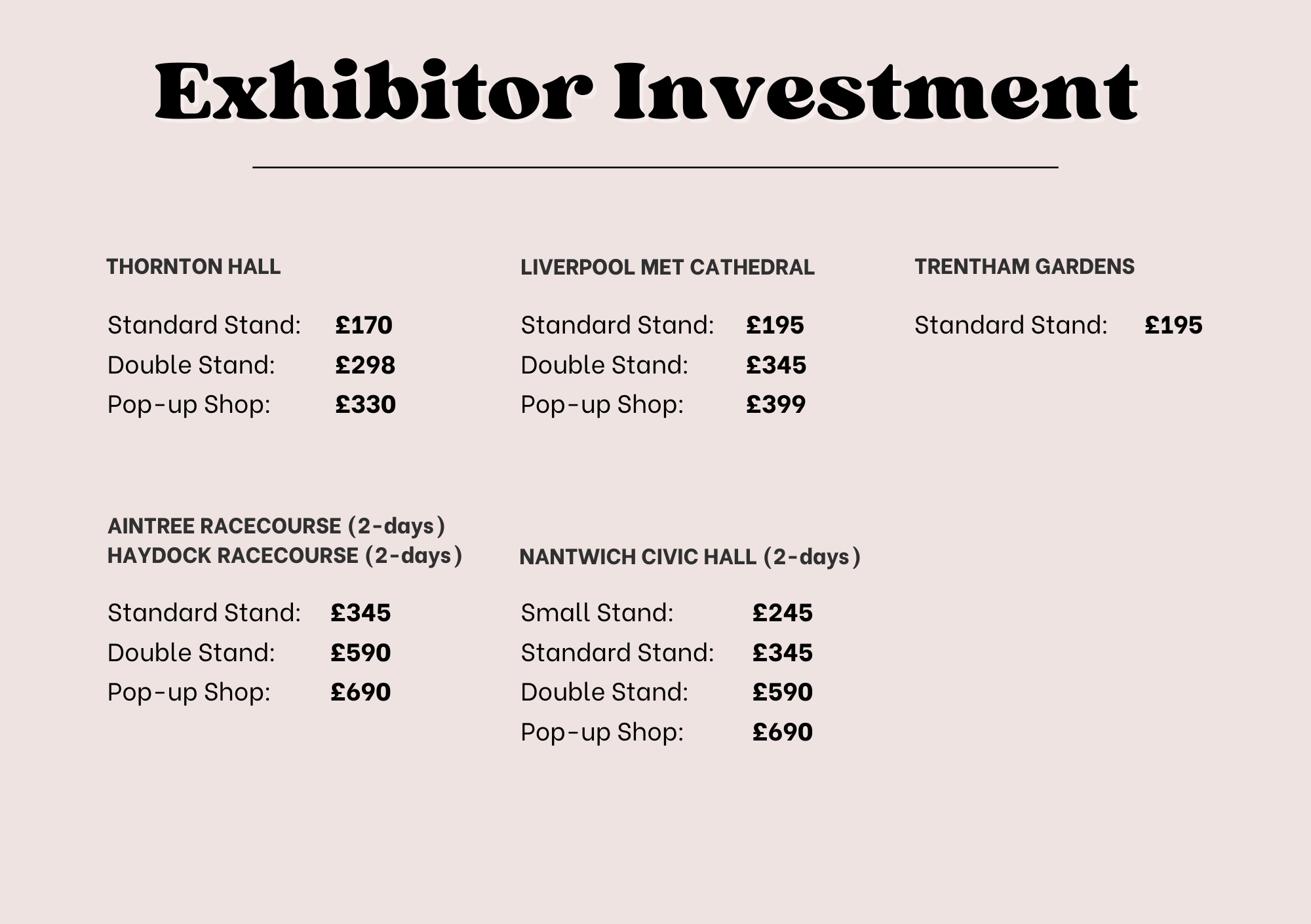 Double Stand: 16ft x 4ft space: (£150 deposit 1-day event/ £250 deposit 2-day event) with or without 2x tables 6ft trestle/5ft round. 10% off for Recommended Suppliers.